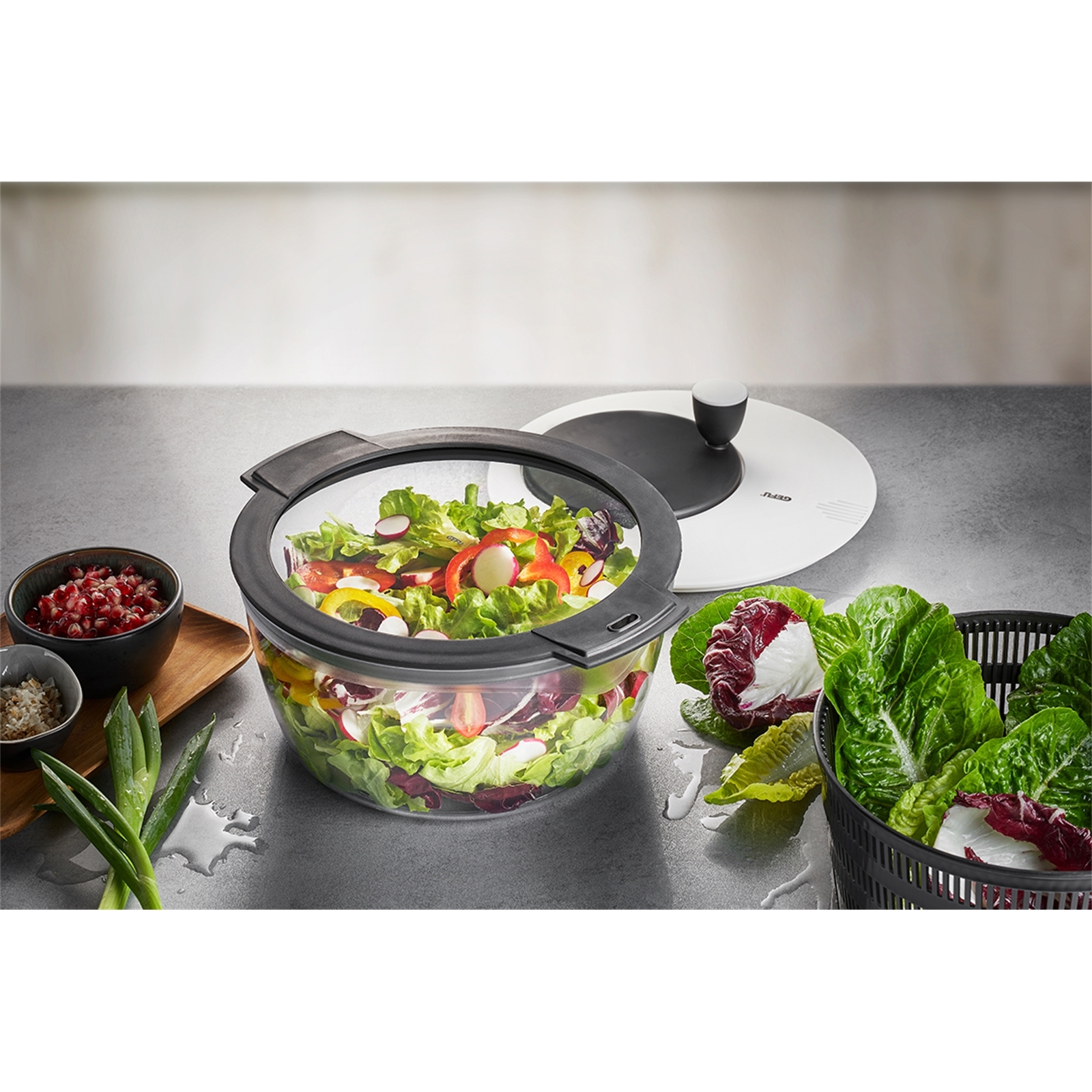 Egal ob Kopf- oder Eisbergsalat, Lollo Rosso oder Lollo Bianco: Im Handumdrehen liefert die hochwertige und leistungsstarke Salatschleuder trockene Blattsalate! Die Öffnung im Deckel ermöglicht es Flüssigkeit abzugießen ohne den Deckel anzuheben. Besonders praktisch: Das Kunststoffsieb kann auch als Seiher und die Schüssel zum Servieren verwendet werden und mit dem passenden Frischhaltedeckel bleibt der Inhalt knackig frisch.