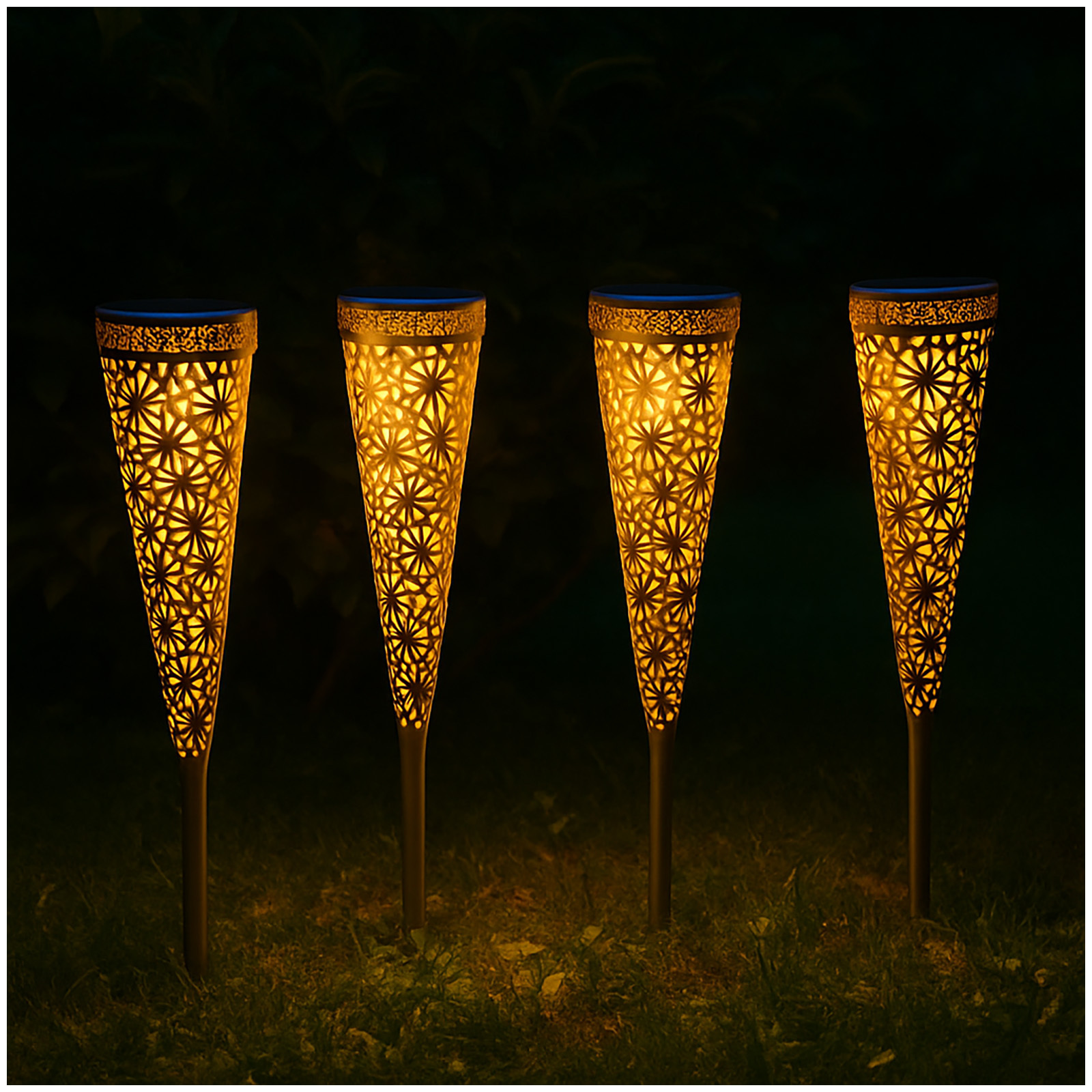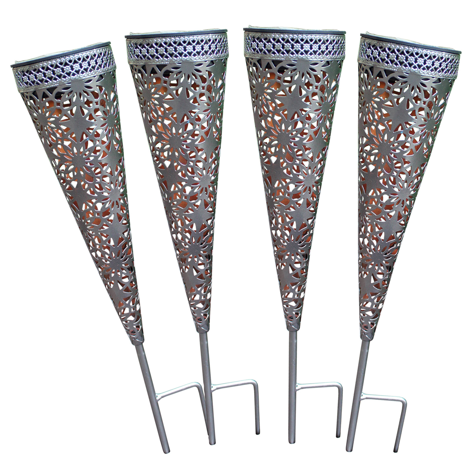 Schaffen Sie mit der Solarlaterne der Serie Luna eine gemütliche Atmosphäre auf Balkon, Terrasse und im Garten. Gefertigt aus Metall mit filigranem Muster verzaubern sie mit interessanten Lichteffekten und tauchen die Umgebung in warmweißes Licht. Die Solarstecker laden sich tagsüber bei eingeschaltetem Schalter mit Sonnenenergie auf. Die Leuchtdauer beträgt nach dem vollständigen Aufladen ca. 6-8 Stunden. Maße: Höhe mit Erdspieß 40 cm Höhe ohne Spieß 25 cm Ø oben 8 cm. Lieferung: 4 Stück