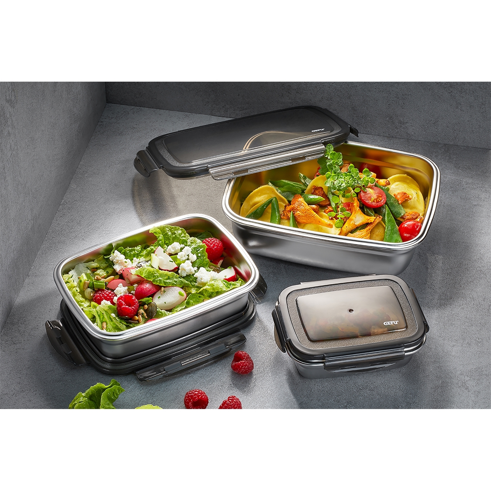 Mehrweg mit Mehrwert. Je länger man ein Produkt verwenden kann, desto besser für die Umwelt. GEFU setzt bewusst auf langlebige Mehrwegprodukte, die dabei helfen, Plastikmüll zu vermeiden und wertvolle Rohstoff- und Energieressourcen zu schonen. Dank ihrer langen Haltbarkeit entfällt das ständige Nachkaufen umweltbelastender Einwegprodukte - gut für die Natur, gut für ’s Portemonnaie. Maße kleine Dose: 14,7 cm x 11,2 cm x 5,3 cm, Maße mittlere Dose: 19,8 cm x 14,5 cm x 6,5 cm, Maße große Dose: 23,1 cm x 18 cm x 8,2 cm