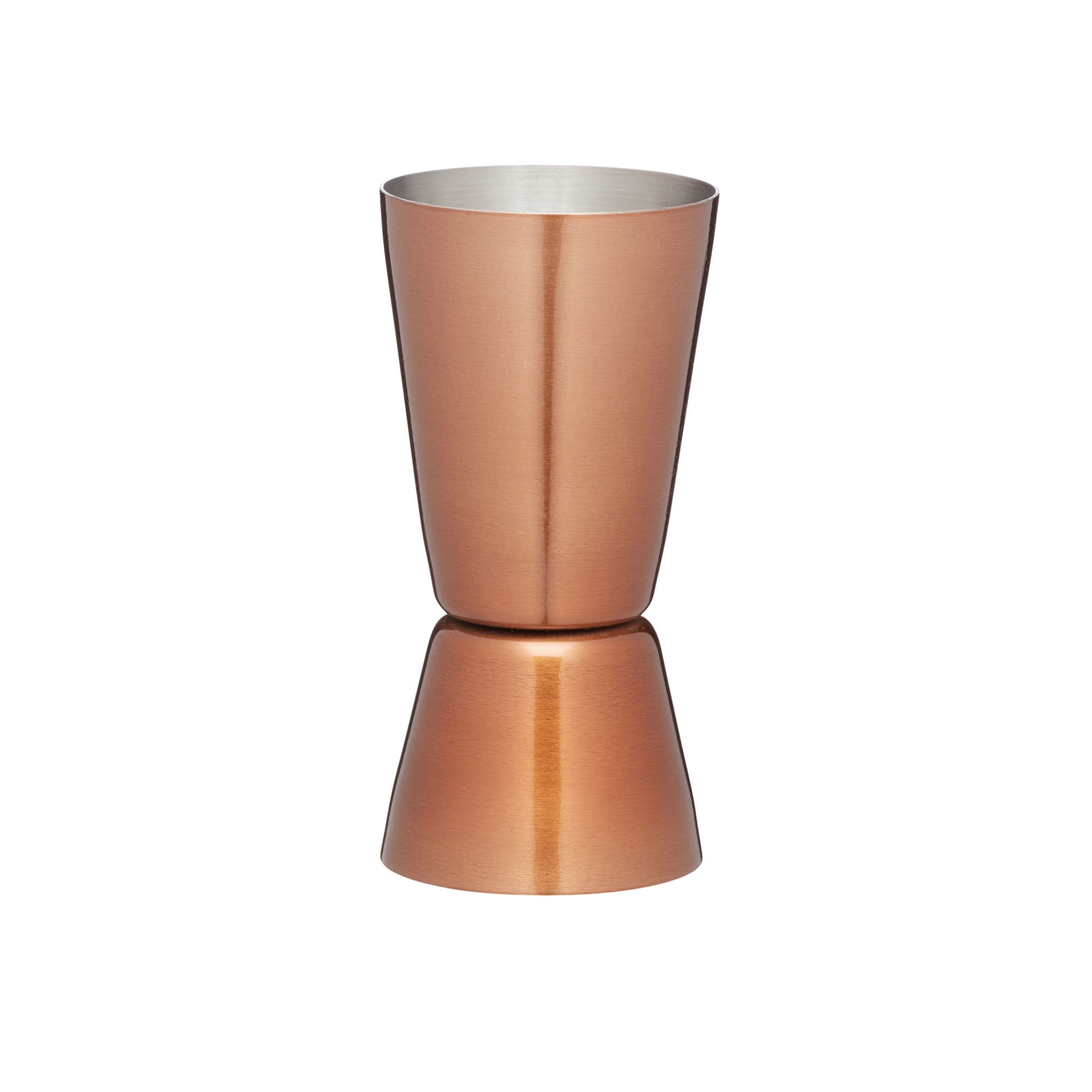 Dieser coole Jigger ist dafür da, herrliche Cocktails zuzubereiten. Denn mit dem Bar-Messbecher werden Spirituosen für Cocktails abgemessen. Das Bar-Maß ist aus strapazierfähigem Edelstahl und hat eine polierte Kupferoberfläche. Es gibt zwei Seiten des Messbechers: für 25 ml und für 50 ml. Maße: Ø 4,5 cm Höhe 8,5 cm