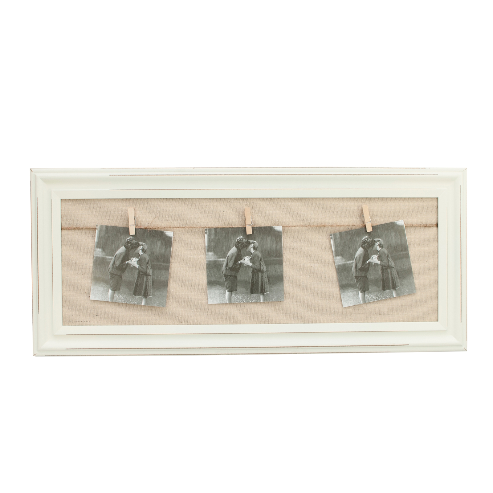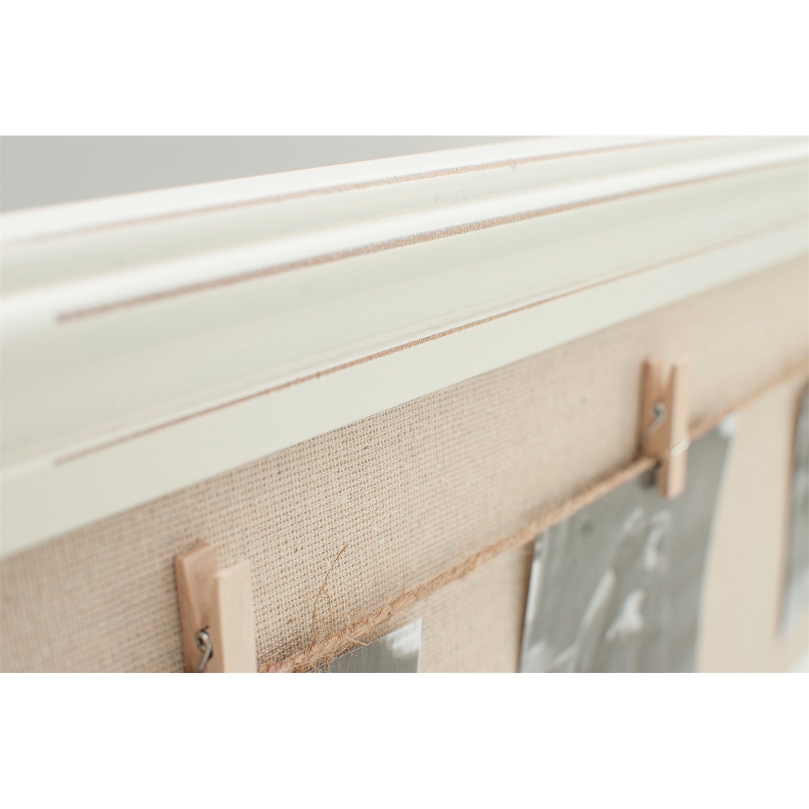 Dekorativer Bilderrahmen im angesagten Shabby Look. Dank der Leine und der kleinen Klammern können Sie gleich 3 Bilder Ihrer Wahl optimal in Szene setzen. Ein echter Blickfang für ihre Wand! Abnutzungs-und Gebrauchsspuren sind an diesem Artikel gewollt und gehören zum Stil des Vintagelook.