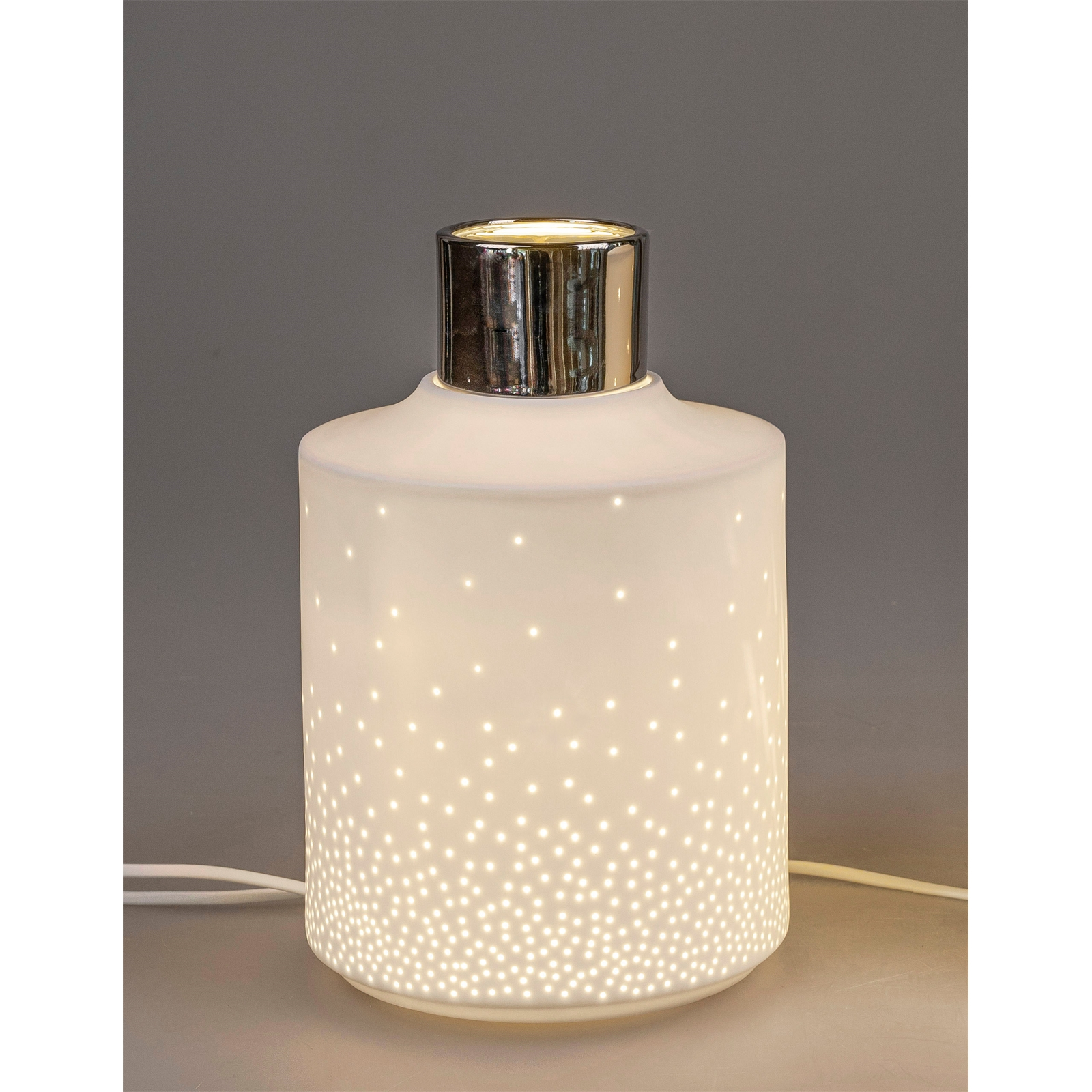 Runde Lampe mit Punkten aus weißem Porzellan gefertigt mit Durchbruch und glänzendem, silbernem Element veredelt.