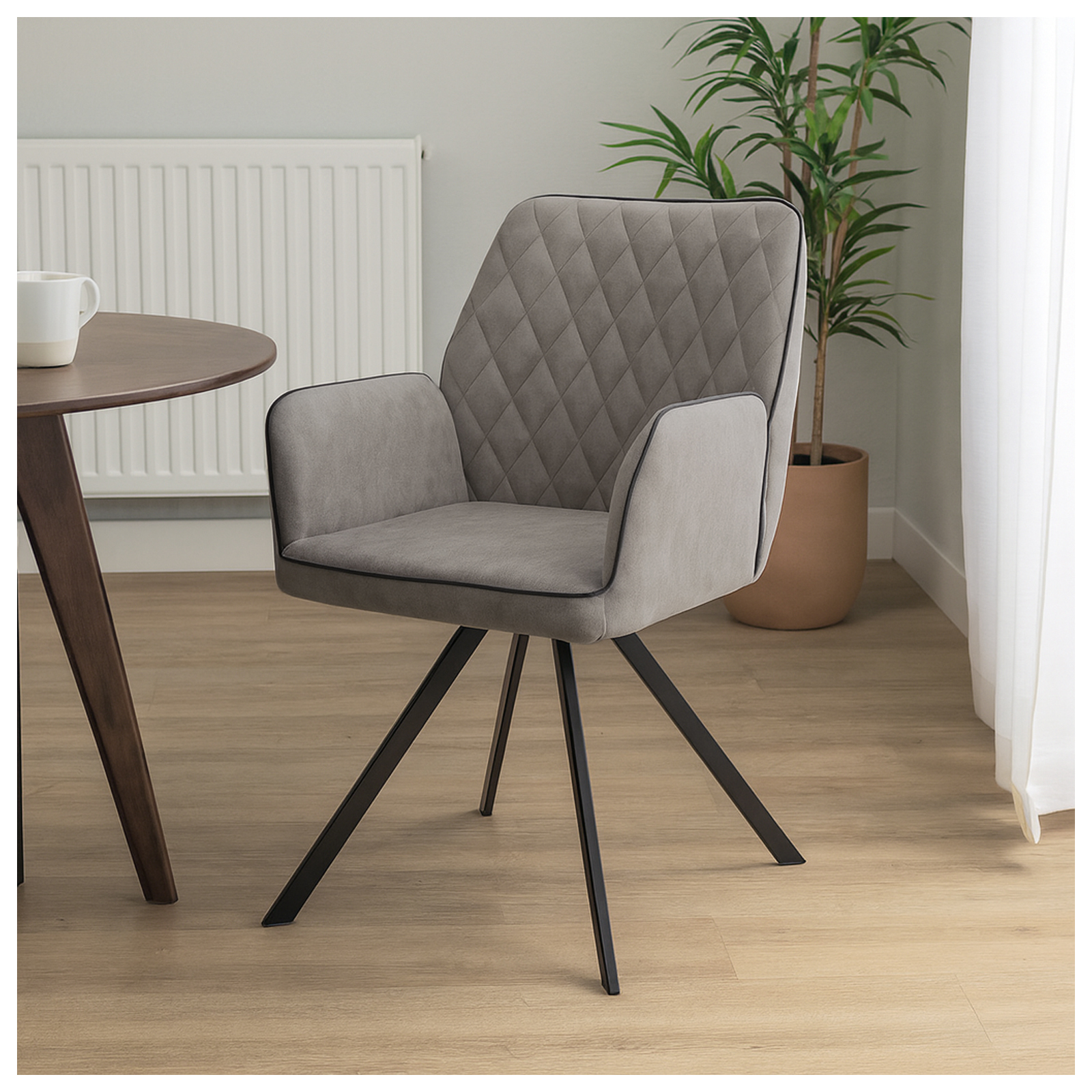 Der Stuhl Tumalo fügt sich harmonisch in Ihr Wohnambiente ein und verleiht Ihrem Zuhause modernen Retro-Charme. Er besticht durch seine Oberfläche in Wildlederoptik. Rückenlehne mit Ziernähten im Karomuster und kontrastfarbene Paspeln setzen weitere Akzente. Bequem gepolstert und mit hohen Armlehnen bietet der Stuhl ein angenehmes Sitzgefühl. Schräg stehende Stuhlbeine aus Metall sorgen für einen sicheren Stand. Maße 57 x 85 x 64 cm, Sitzhöhe 47 cm, Sitztiefe 57 cm, belastbar bis 140 kg