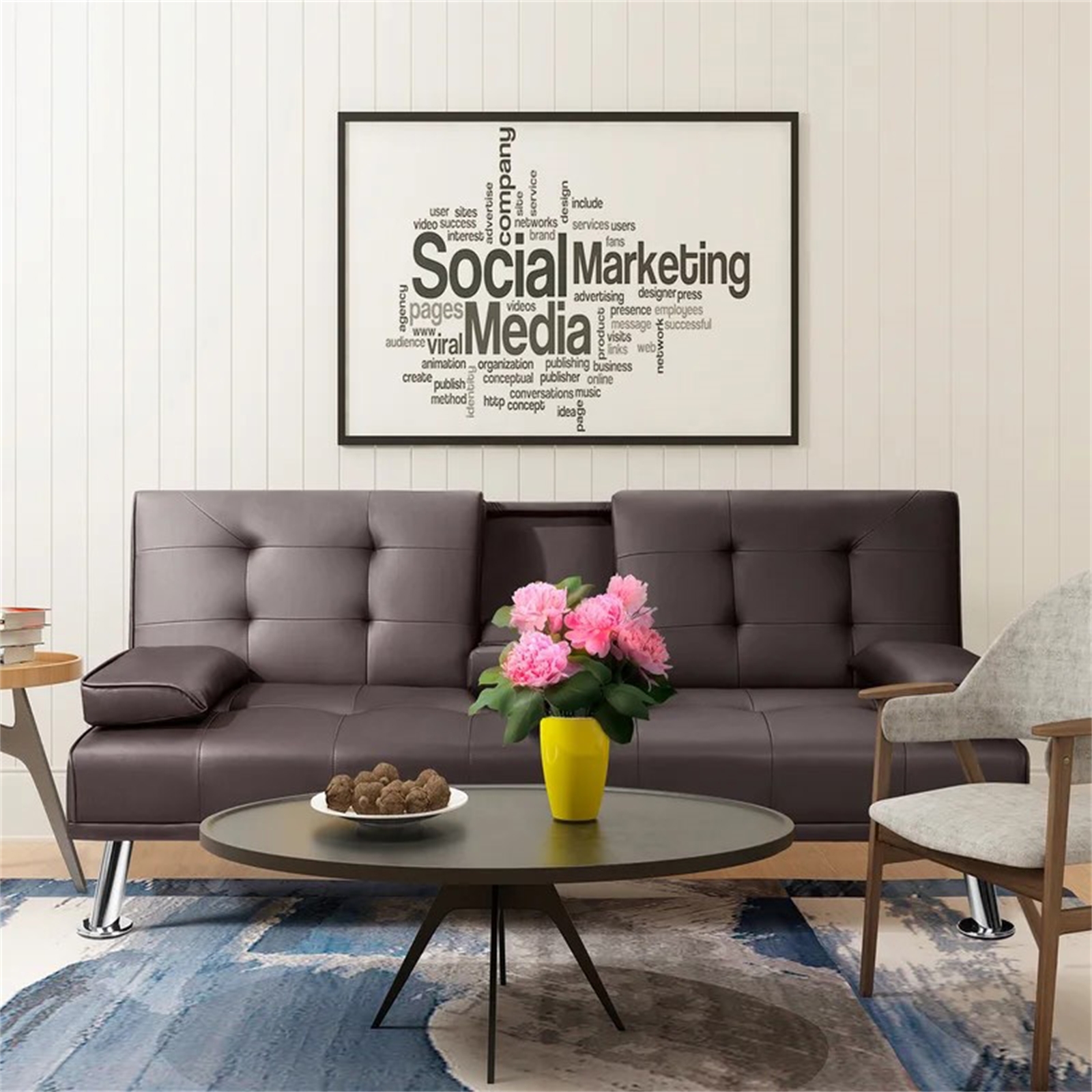 Das Sofa Marwan im eleganten Design fügt sich in nahezu jedes Wohnambiente harmonisch ein. Es besticht durch seinen robusten Bezug in Kunstleder. Gut gepolstert und mit Armlehnen und Mittelkonsole mit Getränkehalter lässt es sich bequem darauf Platz nehmen. Die verchromten Metallbeine sorgen für einen sicheren Stand. Zudem verwandeln Sie dieses Polstermöbel mit nur wenigen Handgriffen in ein Gästebett.