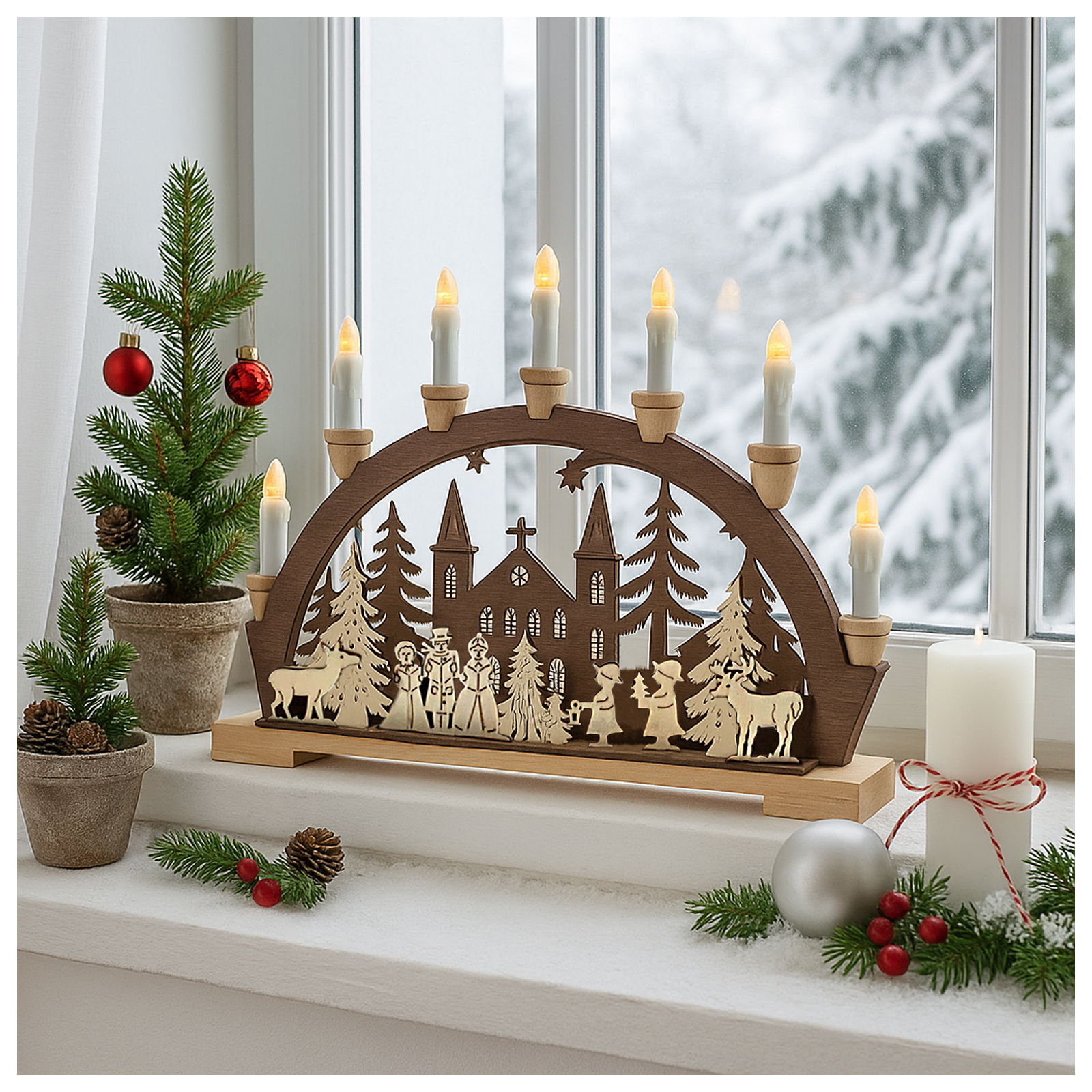 Ein Schwibbogen macht das festlich geschmückte Ambiente in der Advents- und Weihnachtszeit perfekt. Dieser detailreich gestaltete Lichterbogen aus Holz mit klassischen Spitzkerzen zeigt Sternsinger vor der Kirche. Platziert auf Fensterbank oder Kaminsims sorgt der Schwibbogen mit warmweißer LED-Beleuchtung für eine besinnliche Atmosphäre. Maße B/H/T 45 x 34 x 5 cm, 10 LED-Lichter, batteriebetrieben (2x AA nicht im Lieferumfang enthalten), Material: Holz