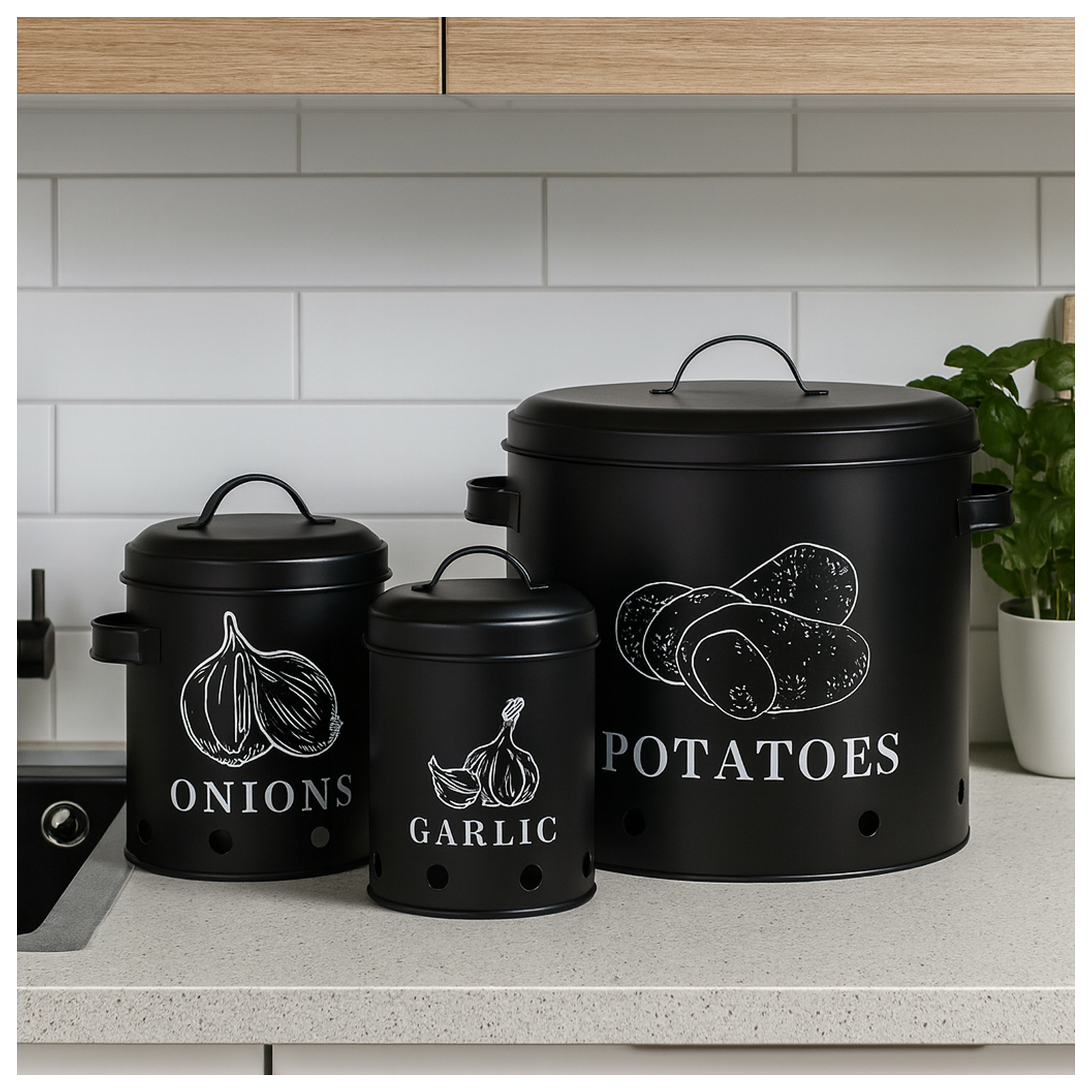 Die Dosen sind speziell für die optimale Lagerung von Kartoffeln, Zwiebeln und Knoblauch konzipiert. Dank der Belüftungslöcher an der Unterseite bleibt das Gemüse länger frisch und vor Feuchtigkeit geschützt.