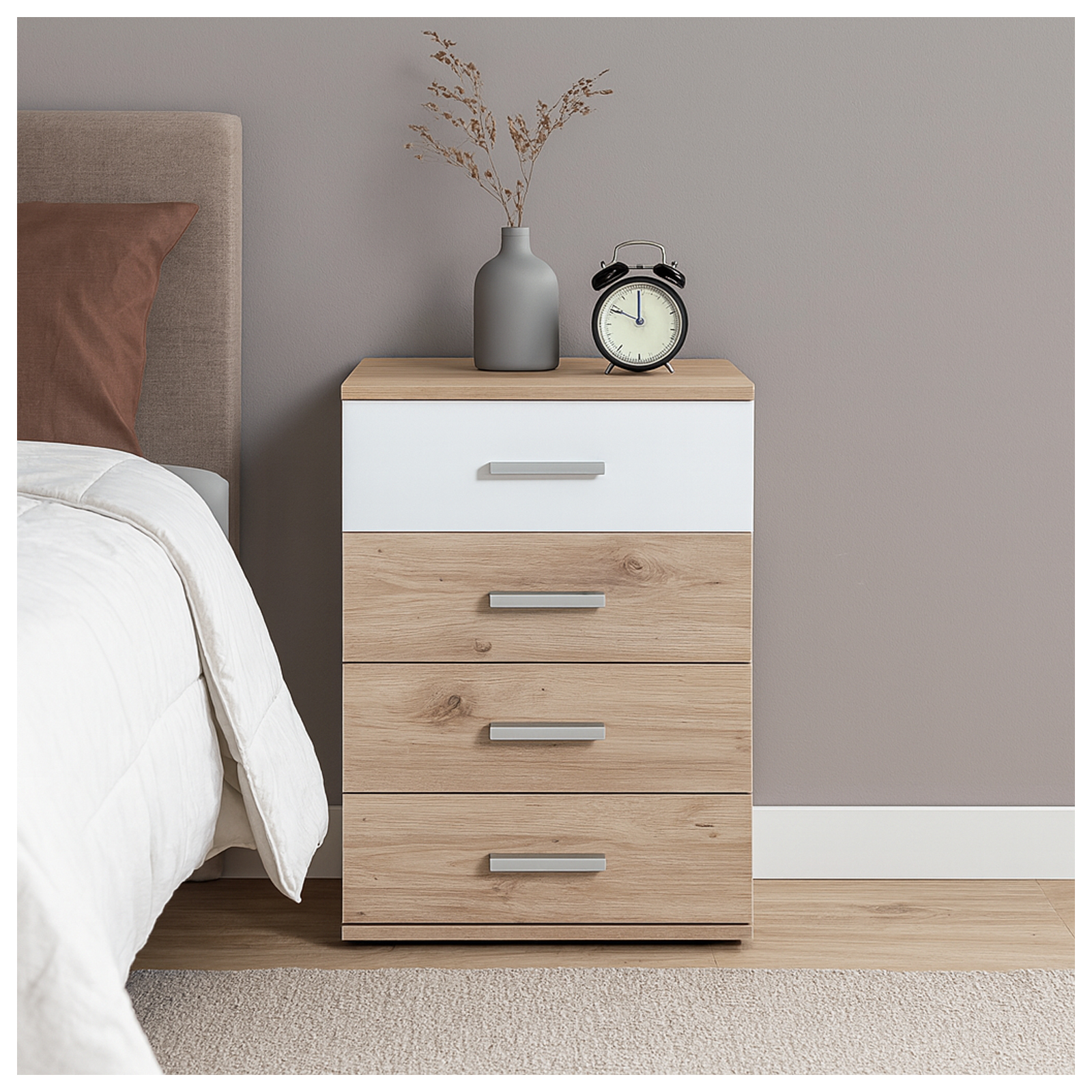 Die vier Schubladen sind mit eleganten silberfarbenen Griffen ausgestattet und lassen sich leicht öffnen und schließen. Dank der klaren Linien und der zeitlosen Optik lässt sich der Nachtschrank problemlos in unterschiedliche Einrichtungsstile integrieren.