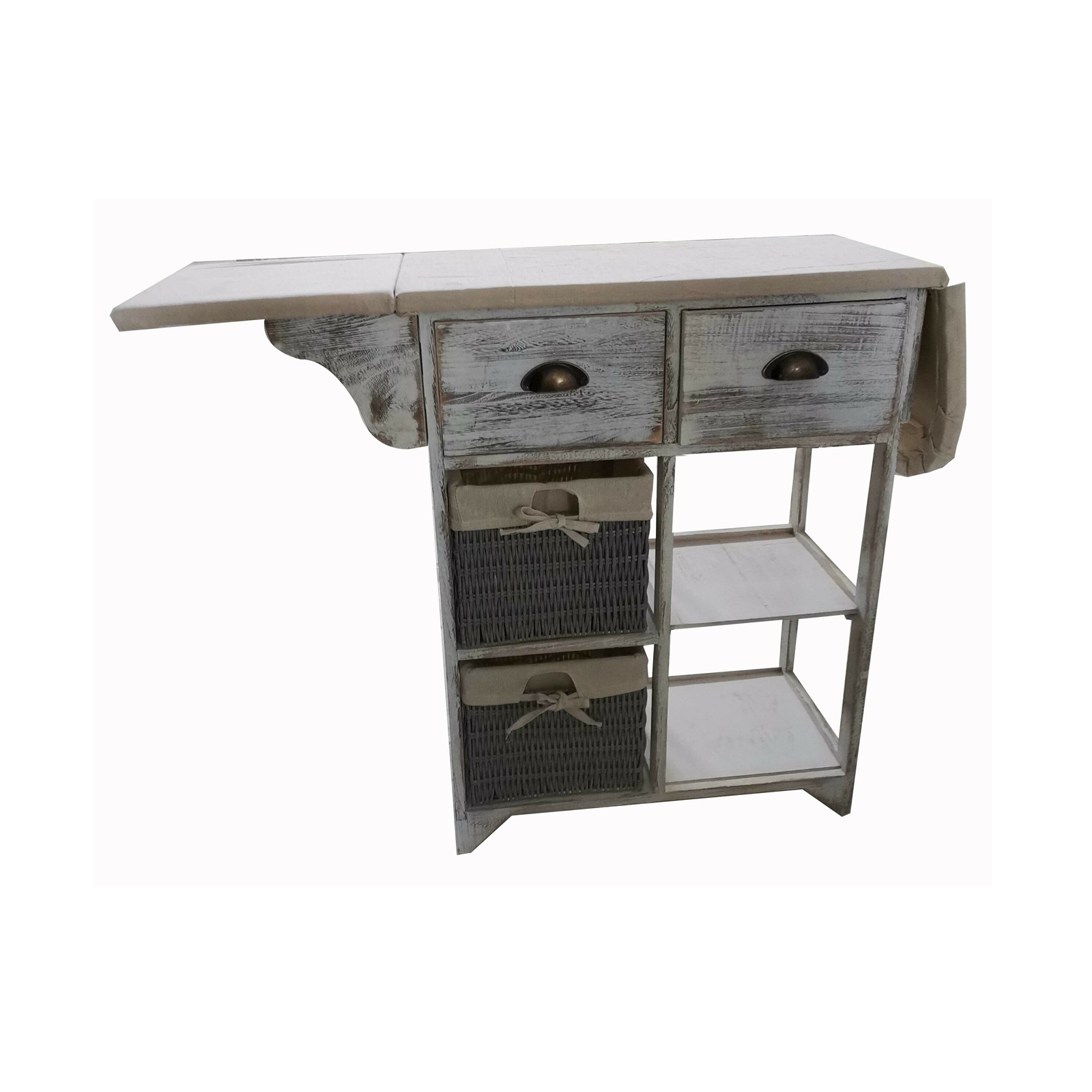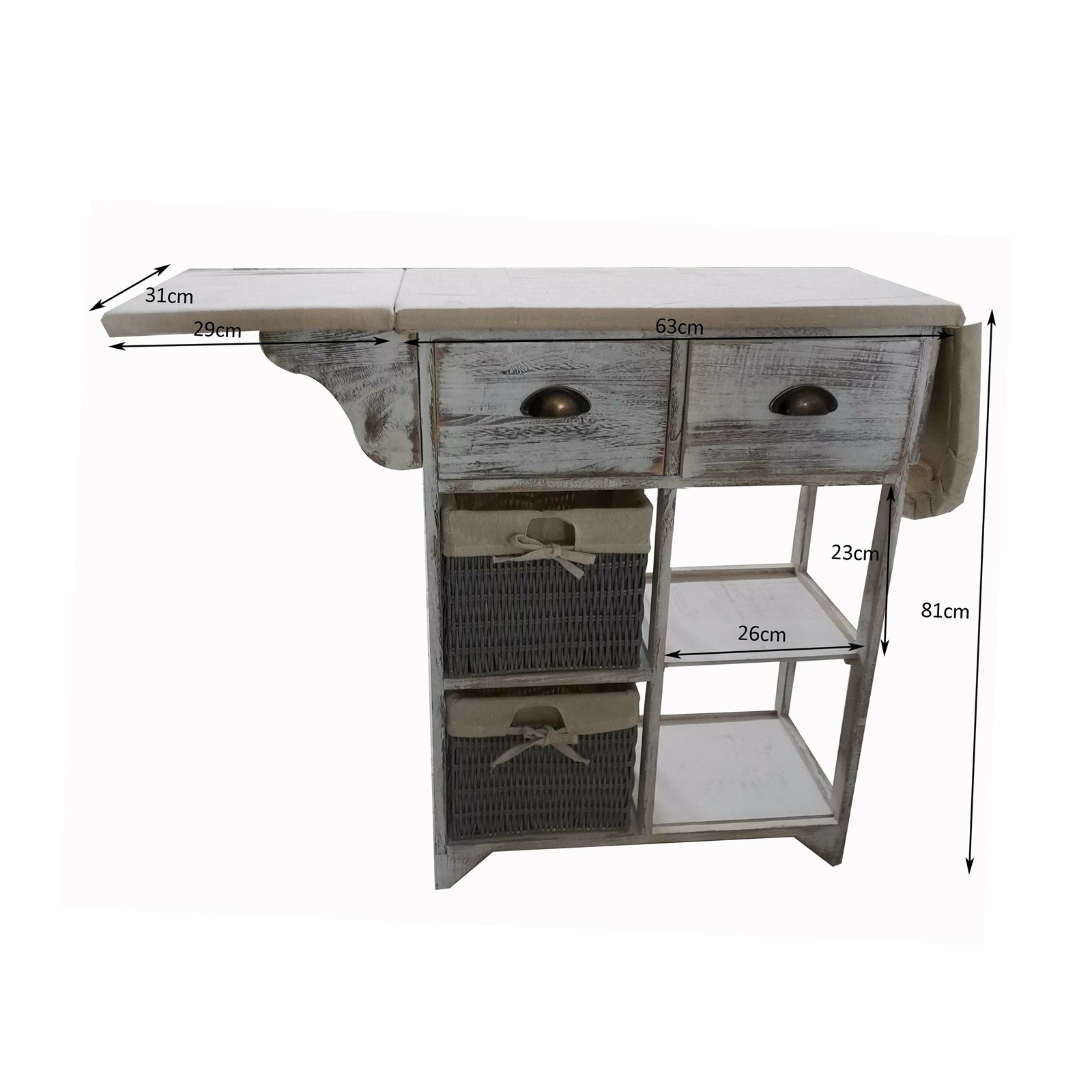 So macht Hausarbeit Spaß! Klappen Sie die seitlichen Teile hoch und schon haben Sie einen praktischen Bügeltisch. Zwei Schubladen, zwei Körben und zwei Ablageregale bieten zusätzlich viel Stauraum. Das schlichte und elegante Design in der Farbe Vintage Weiß fügt sich harmonisch in jeden Wohnbereich ein. Der Bügeltisch und die Körbe haben eine Stoffbespannung. Maße 63-122 x 81 x 31 cm (BxHxT)