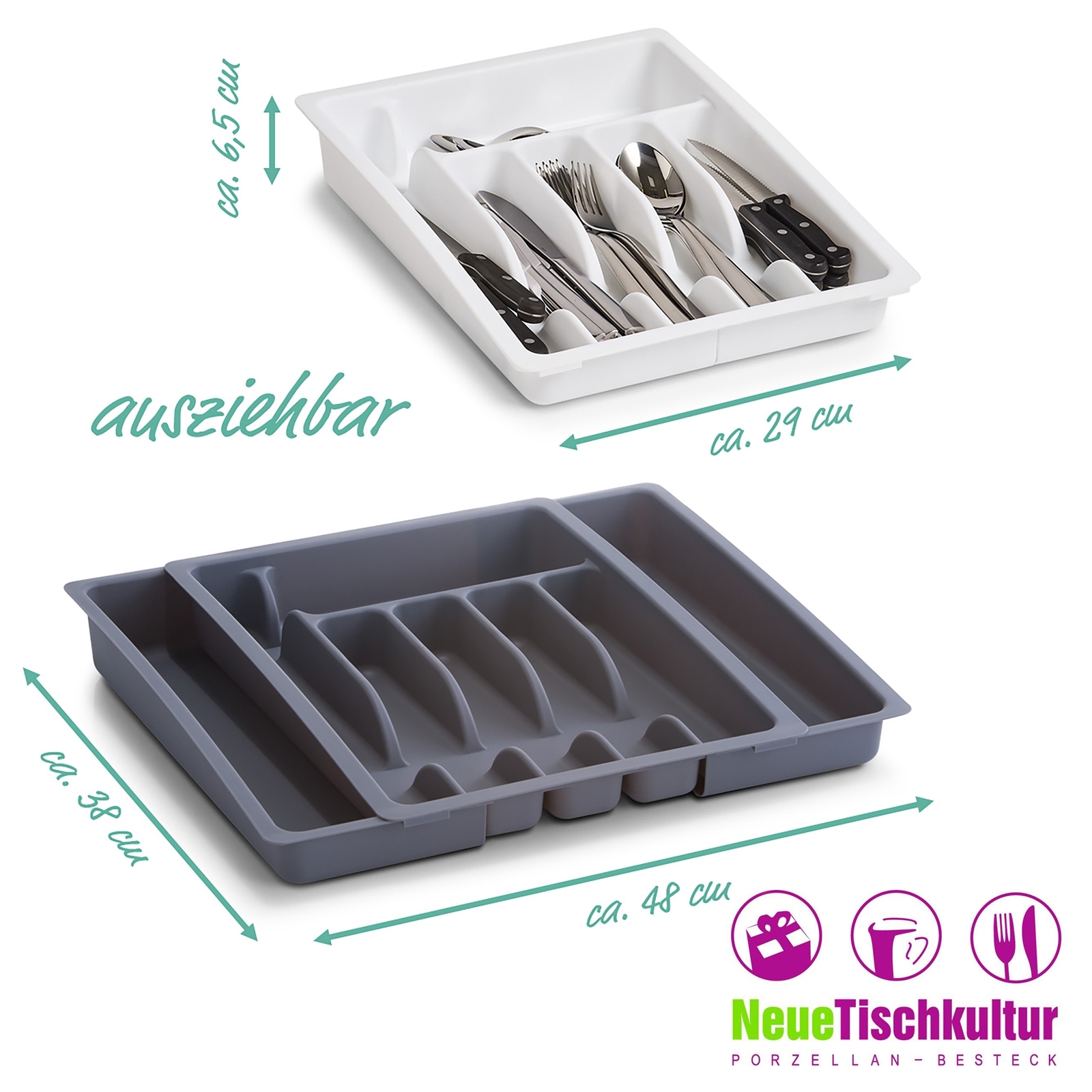 Der Besteckkasten bietet eine ganze Menge Platz für Löffel, Messer und Co. Dank der flexiblen Ausziehfunktion können noch zwei weitere Fächer genutzt werden. Erhältlich in verschiedenen Farben. Maße 29-48 x 38 x 6,5 cm